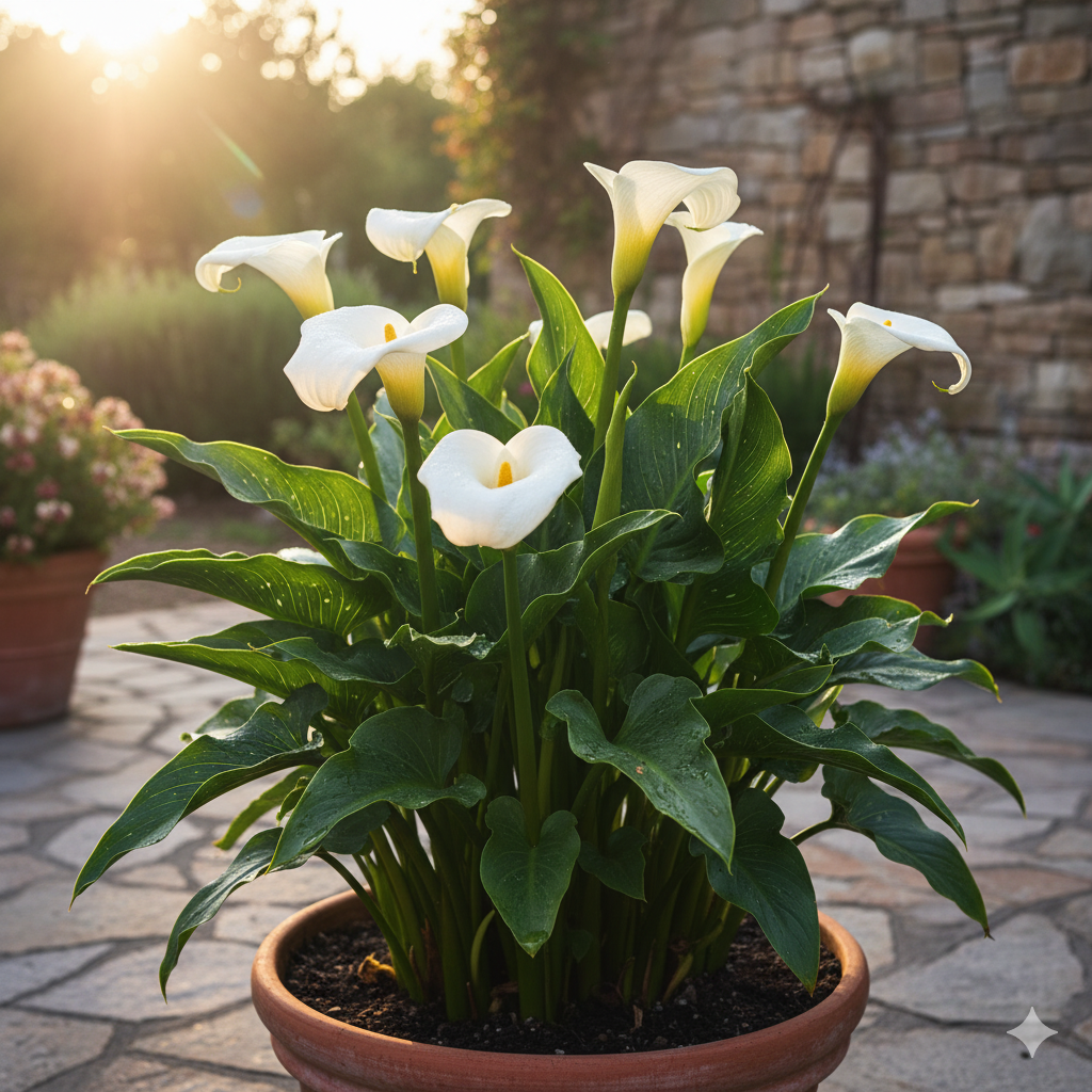 Calla Pianta ornamentale ( Zantedeschia ) I fiori sono singoli , un asse centrale e foglie voluminose con la forma detta spata. La sua posizione naturale e′ in zone ricche d′acqua. Clima: Soffre il freddo e la posizione ideale e′ a mezz′ombra... 08-11-2025